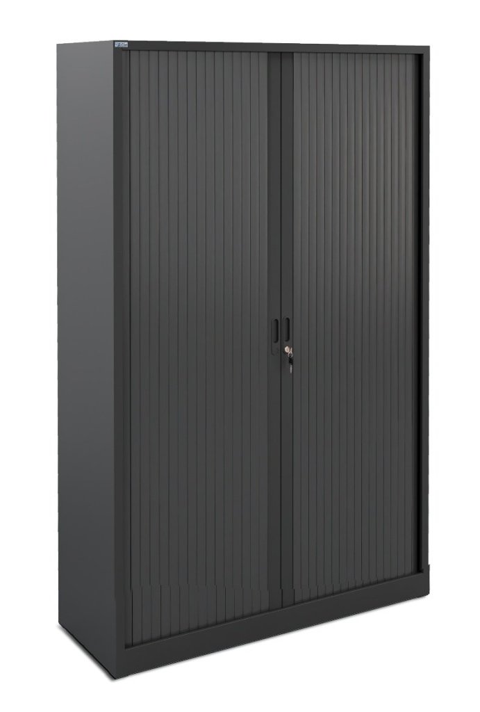 Akten-Rollladenschrank 17123, mit Horizontal-Jalousie, 4x Fachboden. Fachboden-Tragkraft 50 kg. Korpus-/Jalousienfarbe RAL 7016 Anthrazitgrau. H x B x T 1950 x 1000 x 450 mm.