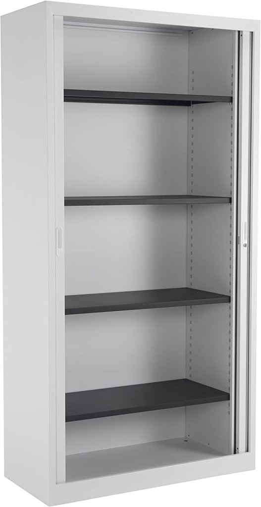 Akten-Rollladenschrank 17123, mit Horizontal-Jalousie, 4x Fachboden. Fachboden-Tragkraft 50 kg. Korpus-/Jalousienfarbe RAL 7035. H x B x T 1950 x 1000 x 450 mm.