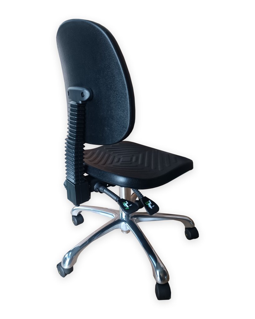 Arbeitsstuhl mit Sitz und Rückenlehne aus PUR-Schaum, der die Normen für antistatische Umgebungen erfüllt, mit robustem Aluminiumfußkreuz und einer Tragfähigkeit von 130 kg.