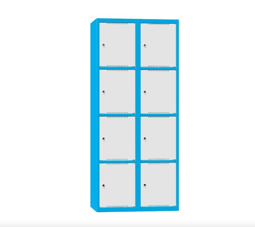 Box-Ladeschrank mit Volltüren BNS ermöglicht die systematische Aufbewahrung von Elektrowerkzeugen sowie das gleichzeitige Laden ihrer Akkus. In jedem Fach befinden sich elektrische Steckdosen. Der integrierte zentrale Elektrokanal spart wertvolle Stellfläche; aus dem Grundriss ragt lediglich das Anschlusskabel mit Stecker heraus. Der Box-Schrank wird mit angeschlossenen elektrischen Komponenten inklusive Zertifizierung der elektrischen Sicherheit geliefert und ist sofort einsatzbereit. Die Schränke sind mit Steckdosen vom Typ E ausgestattet, geeignet für die Tschechische Republik. Der Schrank enthält 8 Fächer, die jeweils mit zwei 230 V / 16 A Steckdosen ausgestattet sind. Abmessungen: Höhe 1850 × Breite 800 × Tiefe 500 mm. Verriegelung: Zylinderschloss oder Münzschloss.