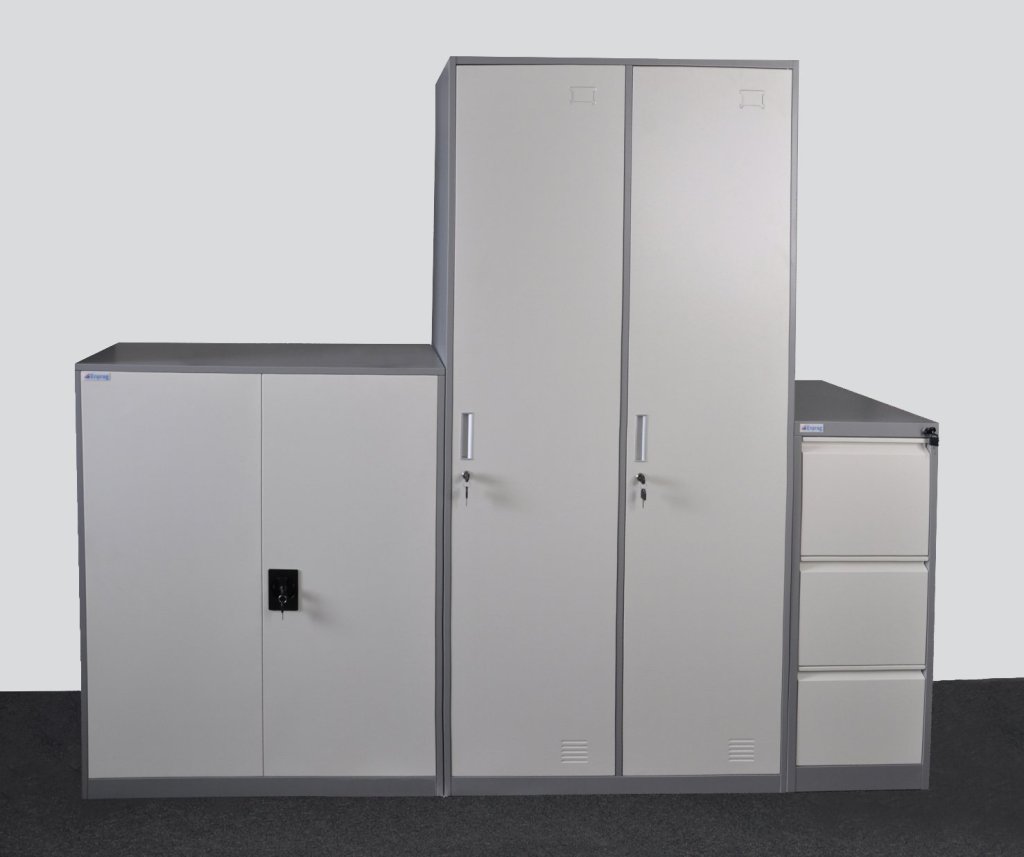Büromöbel Set HDW-S-B24_AC02A_HDK-A03, das Set besteht aus einem Aktenschrank, Hängeregistraturschrank und einem Garderobenschrank. Blechstärke 0,6 mm, pulverbeschichtet, Korpusfarbe Dunkelgrau, Türen und Schubladenfarbe Weiß. Demontiert geliefert, einfache und schnelle Montage.