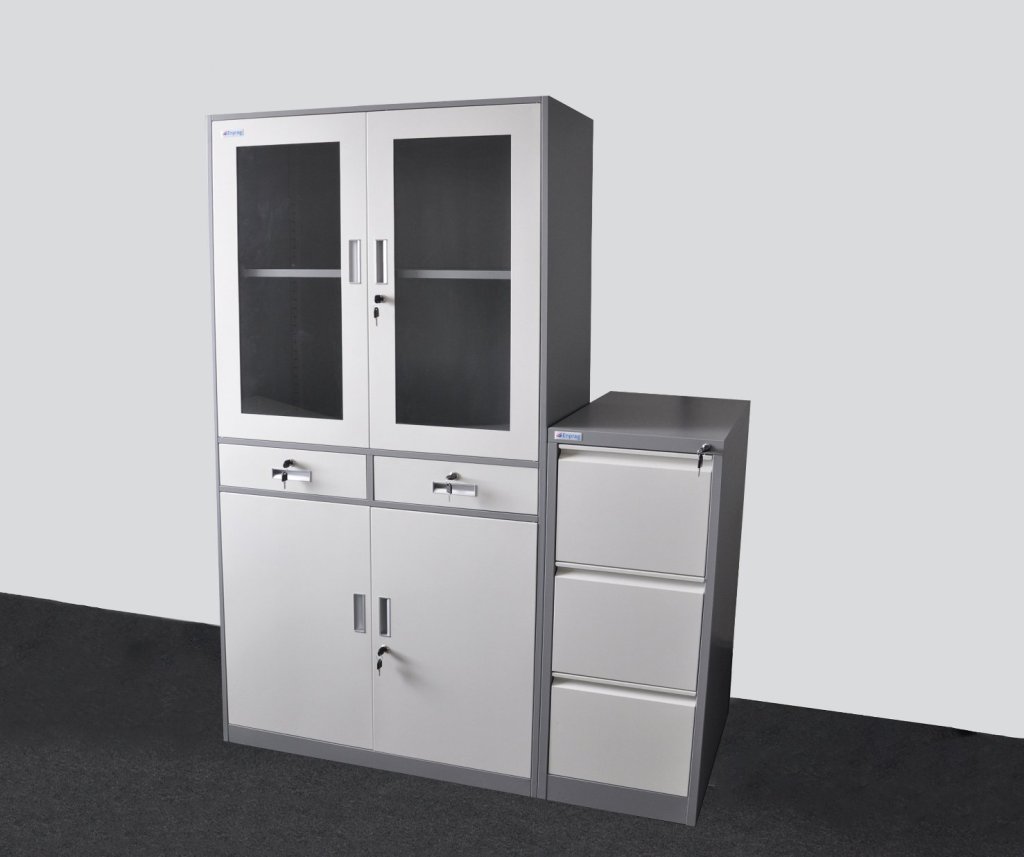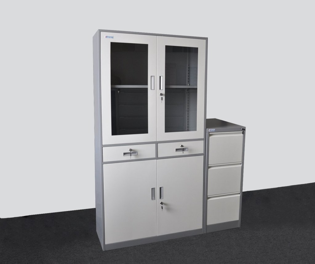 Aktenschrank HDW-S-B24, mit Vollblech- und Glastüren, demontiert, aus Stahlblech 0,6 mm. H x B x T 1800 x 900 x 390 mm, 2x Fachboden, 2x Schublade, Zylinderschloss mit 2 Schlüssel. Pulverbeschichtet, Korpus-/Türenfarbe dunkelgrau/weiß.