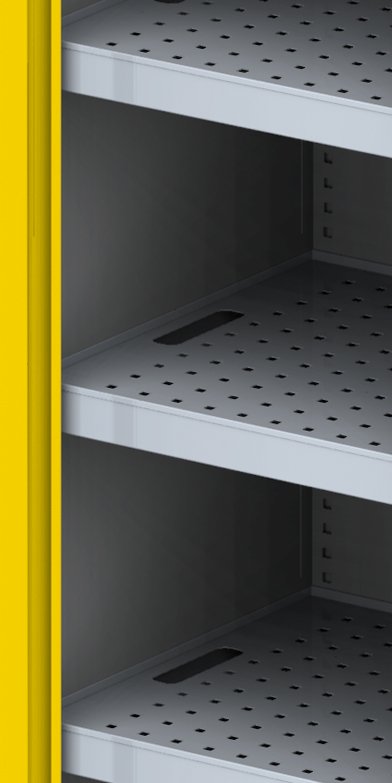 Fachböden (Auffangwannen mit Gitterrost), verzinkt, verstellbar im Raster von 25 mm, Auffangvolumen 19 l.