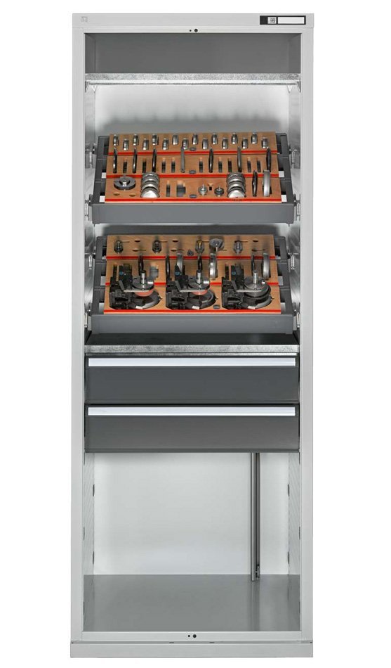 Ein einziges, originelles System regelt die Aufbewahrung von Zerspanungs- sowie Stanzwerkzeugen. Die Aufbewahrung der Zerspanungswerkzeuge und der Stanzwerkzeuge unterscheidet sich lediglich durch die Art der Werkzeughalterungen, die Aufbewahrungs- und Transportmittel sind identisch.
