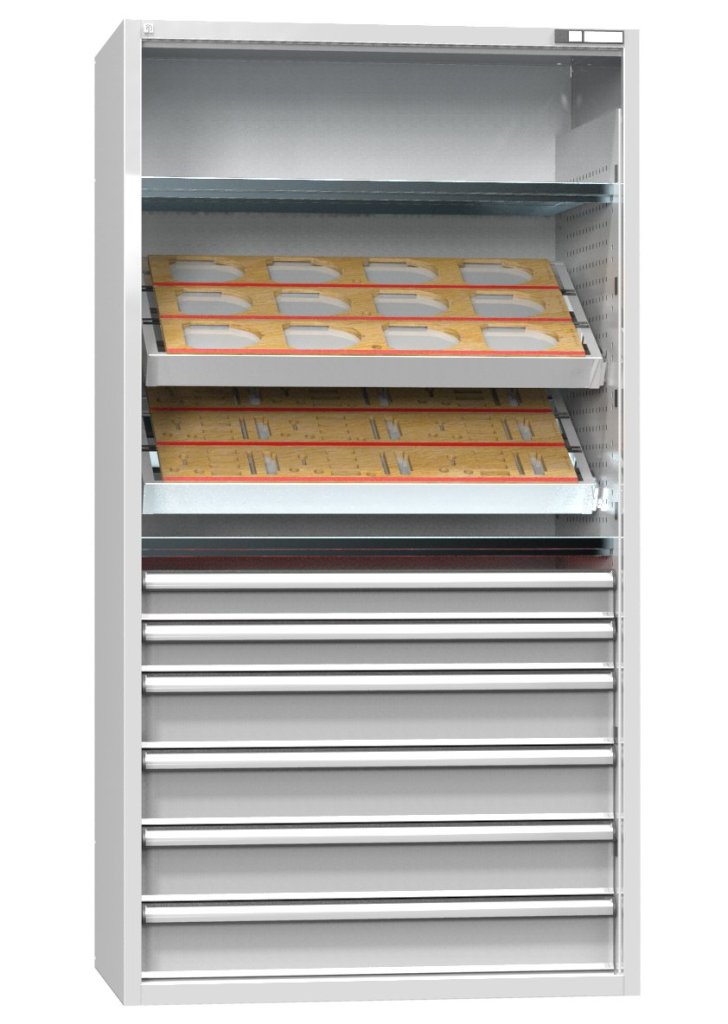 Ein einziges, originelles System regelt die Aufbewahrung von Zerspanungs- sowie Stanzwerkzeugen. Die Aufbewahrung der Zerspanungswerkzeuge und der Stanzwerkzeuge unterscheidet sich lediglich durch die Art der Werkzeughalterungen, die Aufbewahrungs- und Transportmittel sind identisch.