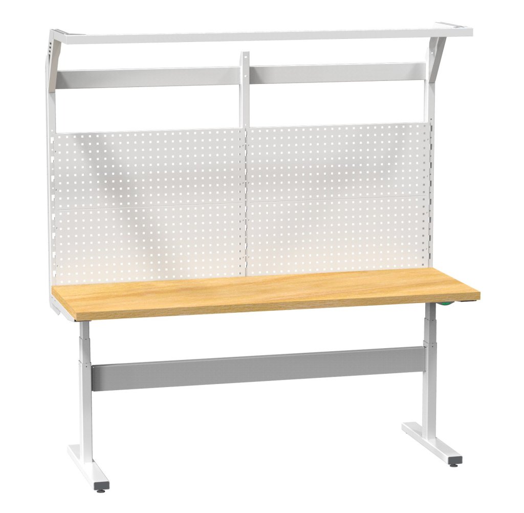 Elektrisch einstellbarer Tisch ERGO mit Aufbau, Höhe 660 - 1100 mm, Breite 2000 mm, Tiefe der Arbeitsplatte 700 mm. Der Tisch habeneinen robusten Rahmen für absolute Steifigkeit, maximale Tragfähigkeit und Stabilität des Arbeitsplatzes. Arbeitsplatte Buche Multiplex 40 mm oder Laminat 38 mm.