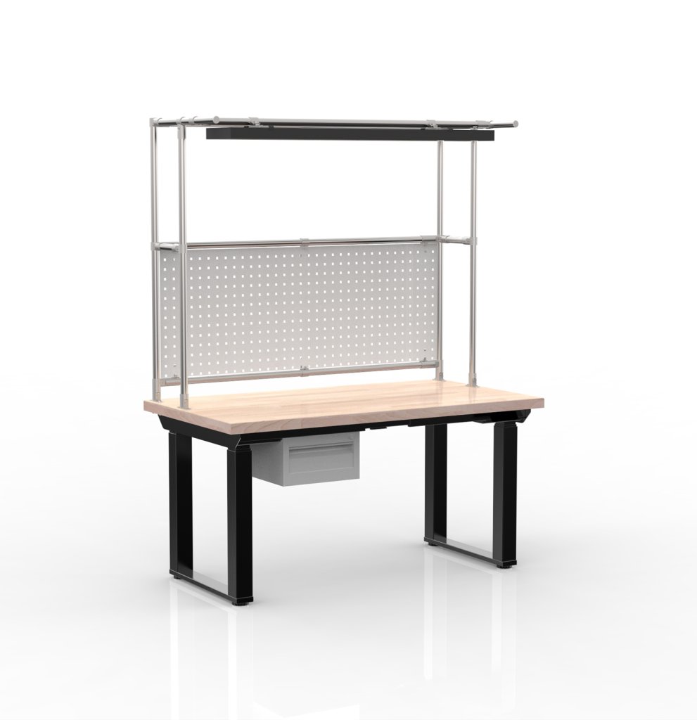Elektrisch höhenverstellbarer Pack-Arbeitstisch mit Arbeitsplatte aus Buchen-Leimholz. Der Tisch ist mit einem Container mit einer Schublade, einer Lochwand zur Aufhängung von Boxen oder Werkzeug und LED-Beleuchtung ausgestattet. Die Arbeitshöhe ist im Bereich von 700 - 1350 mm einstellbar. Die Tragfähigkeit bei gleichmäßiger Belastung beträgt 250 kg. Abmessungen: 1800 - 2450 x 1400 x 750 mm.