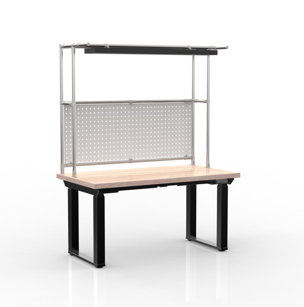 Höhenverstellbarer Tisch mit Aufsatz aus einem Rohrbaukastensystem und Lochblechpaneel. Höhenverstellbereich 726 - 1226 mm. Die Basis des Tisches bildet ein elektrisch höhenverstellbares Gestell mit perfekter Kombination aus Stabilität und Robustheit. Der Tisch ist mit einer 18 mm starken Laminatplatte und LED-Beleuchtung ausgestattet. Tragfähigkeit 70 kg. Tischabmessungen 1765 x 1600 x 800 mm.