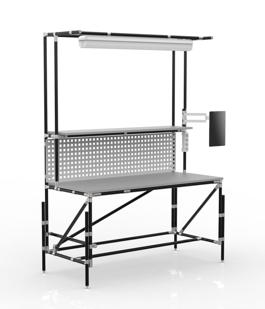 Höhenverstellbarer antistatischer Tisch aus einem Rohrbausatzsystem. Der Tisch ist mit einer ESD-Laminatplatte von 19 mm Dicke ausgestattet, die zuverlässigen Schutz gegen elektrostatische Aufladung bietet. Außerdem enthält er einen ESD-Container, ein ESD-Lochblech, eine Beleuchtung und eine Aluminiumplatte mit A4-Klemme, die Ihnen ermöglicht, wichtige Dokumente griffbereit zu halten. Die Tragfähigkeit bei gleichmäßiger Belastung beträgt 150 kg. Der Tisch hat eine einstellbare Höhe im Bereich von 650 – 950 mm. Abmessungen 2100 x 1500 x 700 mm.