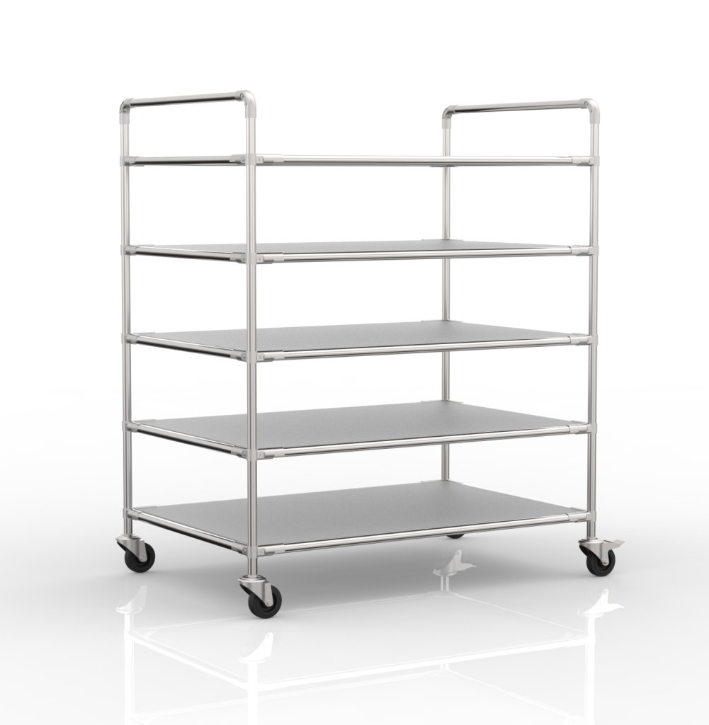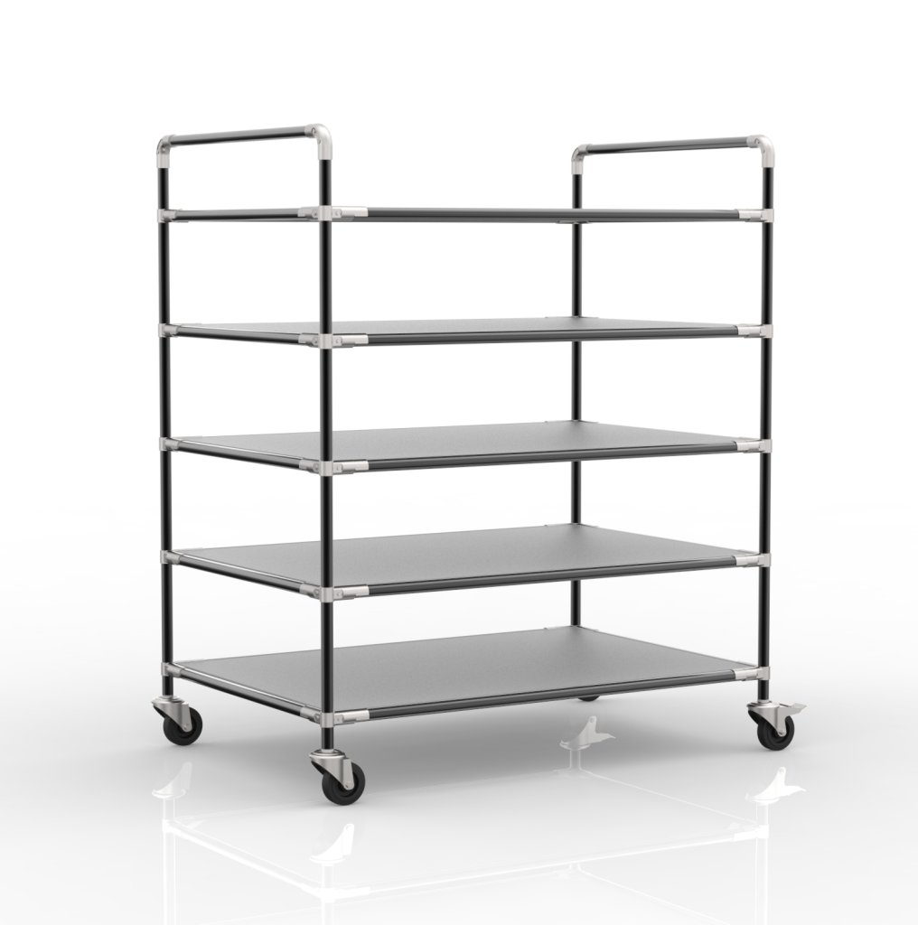 Antistatischer Regalwagen aus einem Rohrsystem-Bausatz ist die ideale Wahl für die Manipulation von waren, die empfindlich auf elektrostatische Entladung reagieren. Der Wagen ist mit einer ESD-Laminatplatte von 18 mm Dicke ausgestattet. Die Maße sind 1530 x 1268 x 868 mm, mit einem Raddurchmesser von 100 mm.