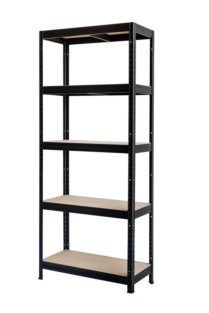 Universal-Regal, Montage ohne Schrauben-System. Regalhöhe 1800 x 1200 x Breite 450 mm Tiefe, 5 Böden mit Verstärkung, Füllmenge von 200 kg. Design in schwarz.