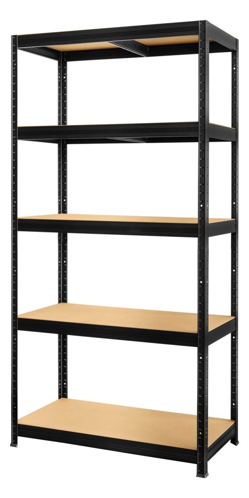 Universal-Regal, Montage ohne Schrauben-System. Regalhöhe 1800 x 1200 x Breite 600 mm Tiefe, 5 Böden mit Verstärkung, Füllmenge von 250 kg. Design in schwarz.