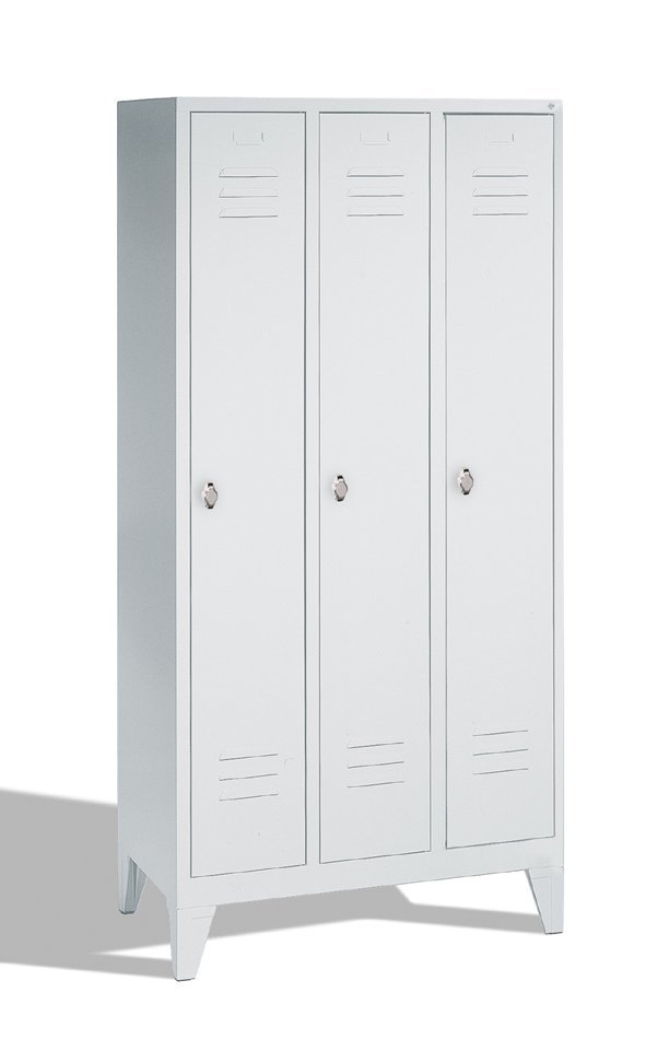 Garderobenschrank mit Füßen, 3 Türen, B x H x T 750 x 1850 x 500 mm. Korpusfarbe RAL 7035 Lichtgrau.