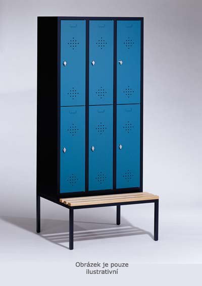 Garderobenschrank CP 8350-40, H x B x T 2090 x 1190 x 500/815 mm, doppelstöckig, mit untergebauter Sitzbank vollständige Beschreibung und Parameter