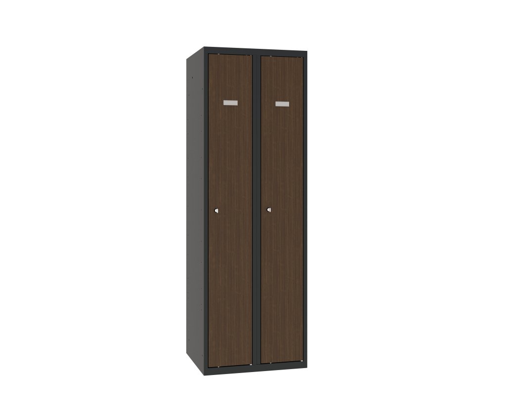 Zweitüriger Kleiderschrank mit verschweißten Laminattüren. Höhe 1800 x Breite 600 x Tiefe 500 mm. Zylinderschloss. Ausstattung in beiden Fächern: Kleiderstange mit zwei Haken, Ablage über der Stange, Spiegel, selbstklebendes Namensschild.