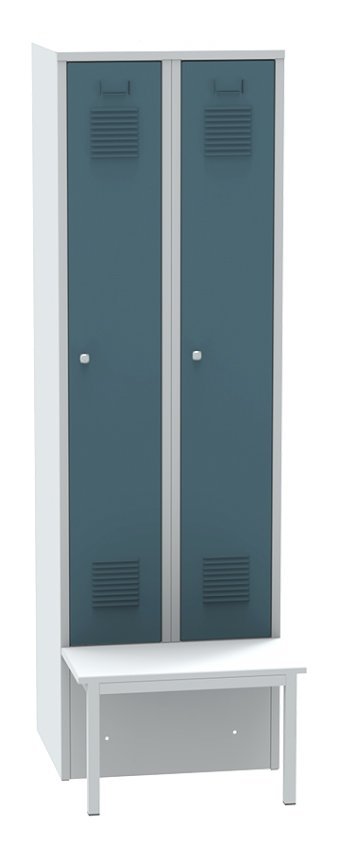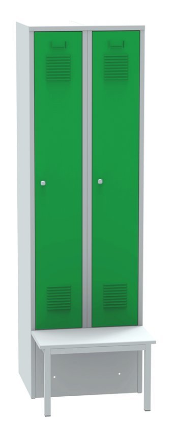 Garderobenschrank mit vorgebauter Sitzbank SALP32_A , H x B x T 1850 x 600 x 810 mm. Korpusfarbe RAL 7035 Lichtgrau. vollständige Beschreibung und Parameter