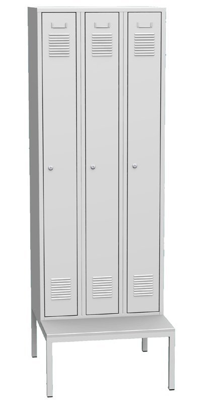 Garderobenschrank mit untergebauter Sitzbank, 3 Türen, B x H x T 750 x 2085 x 810 mm. Korpusfarbe RAL 7035 Lichtgrau. vollständige Beschreibung und Parameter