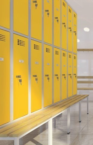 Garderobenschrank Sus 332 W, mit untergabauter Sitzbank P331 W, H x B x T 2190 x 900 x 500 mm.