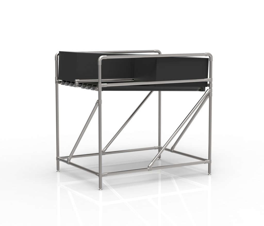 Ein Gefälle Förderer aus einem Rohrbausatzsystem ist für die Lagerung von KLT-Behältern und -Boxen mit den Maßen 600 x 400 x 280 mm vorgesehen. Dieser innovative Förderer ist so konzipiert, dass er die Materialhandhabung erleichtert und die Arbeitseffizienz verbessert. Die Regale bestehen aus Rollenbahnen, die es ermöglichen, KLT-Behälter leicht und reibungslos über die gesamte Länge des Förderers in Richtung des Gefälles der Rollenbahnen zu bewegen. Die Gesamtkapazität beträgt 100 kg. Abmessungen: 1202 x 943 x 1253 mm.