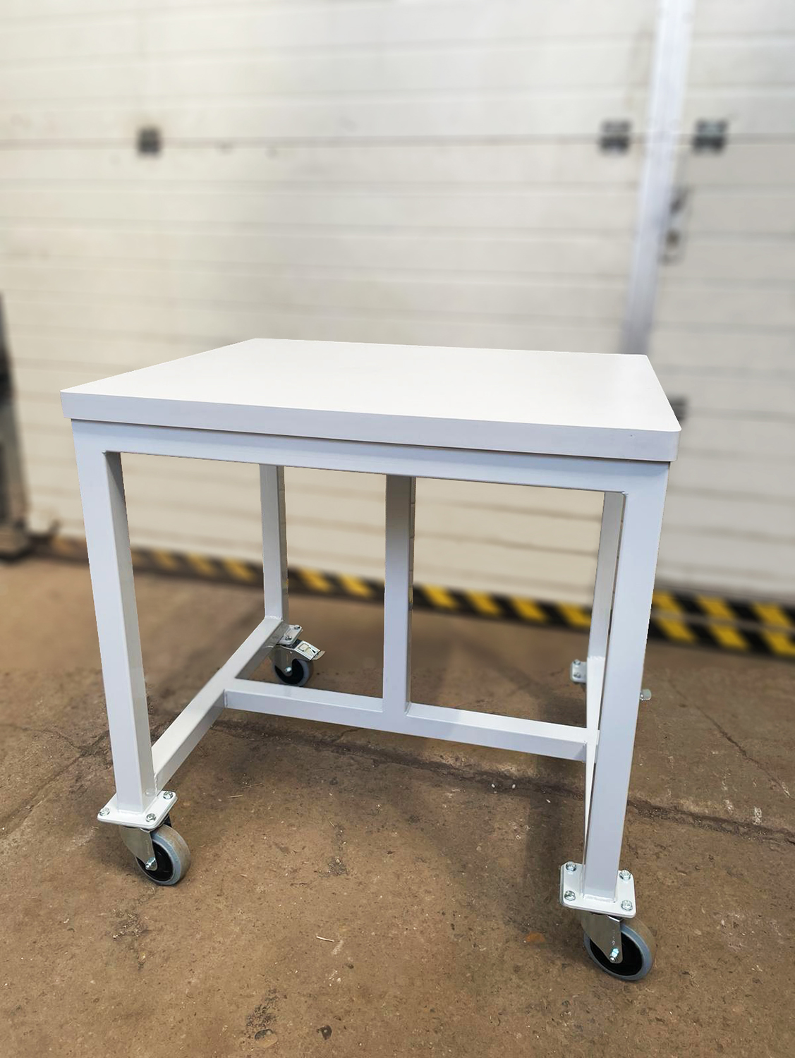Geschweißter Werkstatttisch auf Rollen. Bestandteil des Tisches ist eine ESD-Arbeitsfläche aus einer 19 mm dicken laminierten Platte mit einer Absturzsicherung, zwei Rollen mit einem Durchmesser von 125 mm mit Bremse und zwei Rollen ohne Bremse. Die Konstruktion aus geschweißtem 45 x 45 mm Vierkantrohr ist schwarz lackiert. Arbeitshöhe 880 mm. Tragfähigkeit bei gleichmäßiger Belastung beträgt 500 kg. Abmessungen 880 x 1500 x 680 mm.