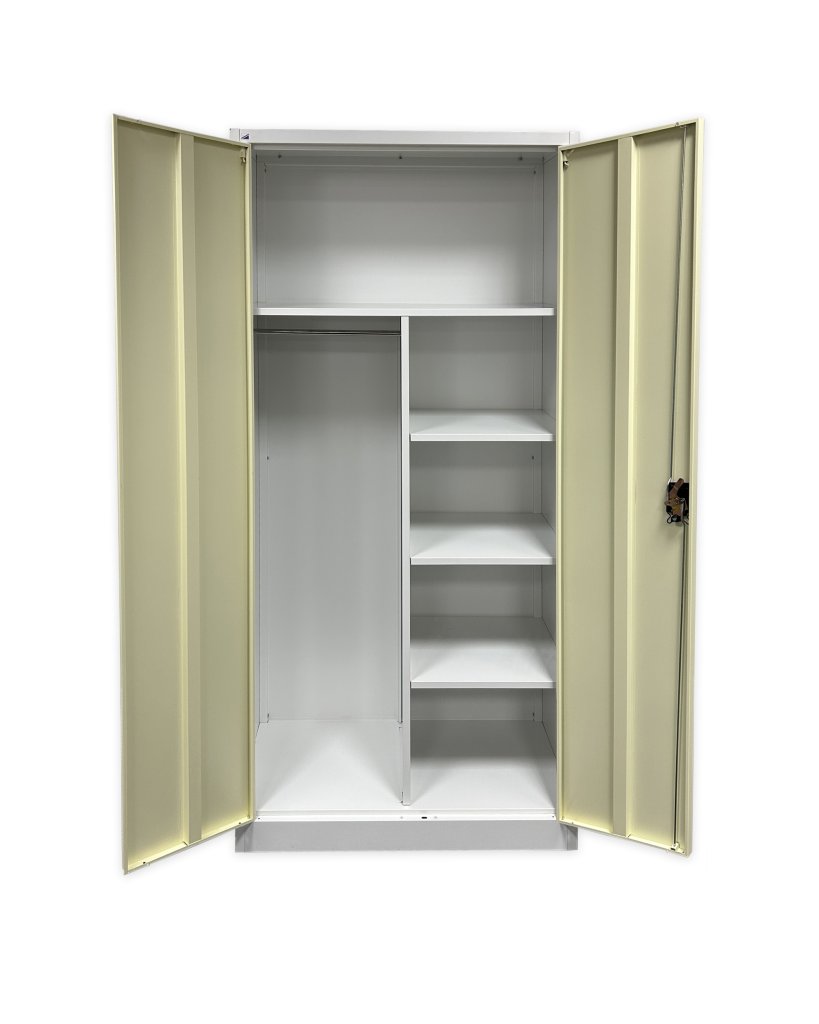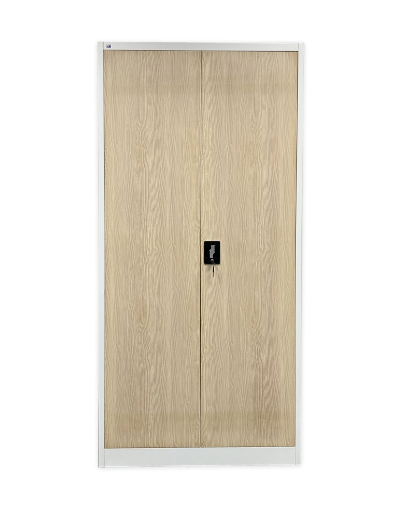 Garderoben-/Universalschrank JF-C34_wood1, demontiert, aus Stahlblech 0,6 mm. H x B x T  1950 x 900 x 450 mm, 4x Fachboden, Zylinderschloss mit 2 Schlüssel. Pulverbeschichtet, Farbe weiß RAL 9003/Nachahmung helles Holz..