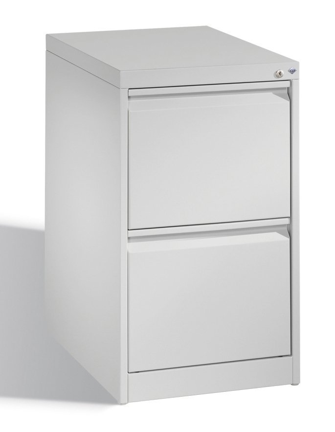 Registraturschrank mit 2 Schubladen für die Dokumenten und Hängemappen A4, H x B x T 675 x 404 x 600 mm. Korpusfarbe RAL 7035 Lichtgrau.