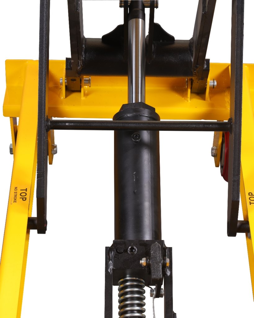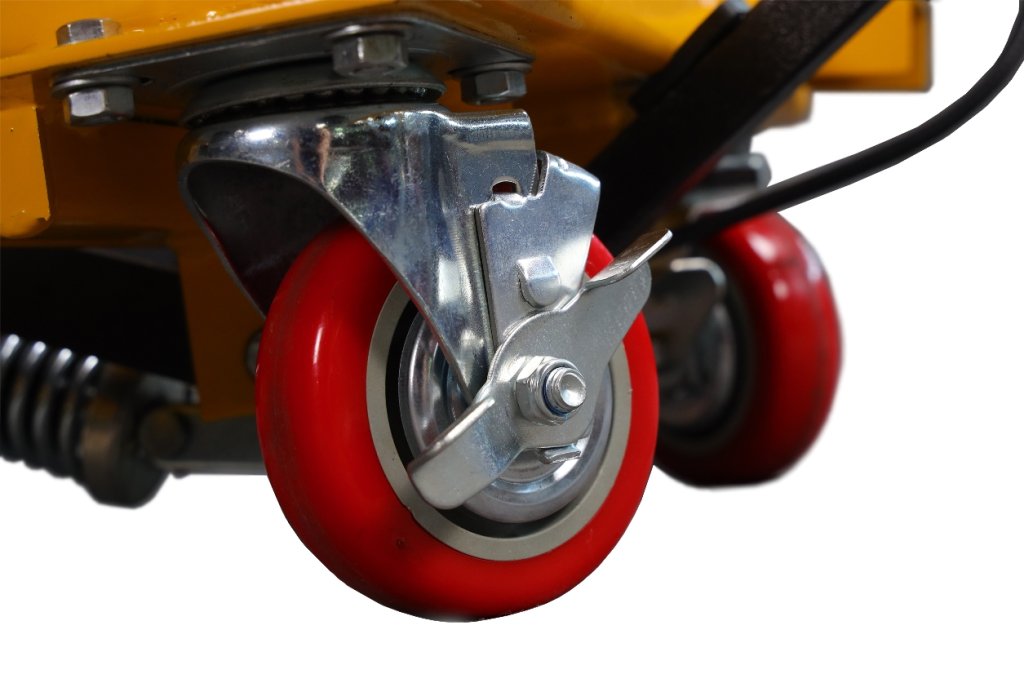 Scherenhebebühne ausgestattet mit Fußhydraulikpumpe mit einer Tragfähigkeit von 1000 kg und maximaler Hubhöhe von 1000 mm.