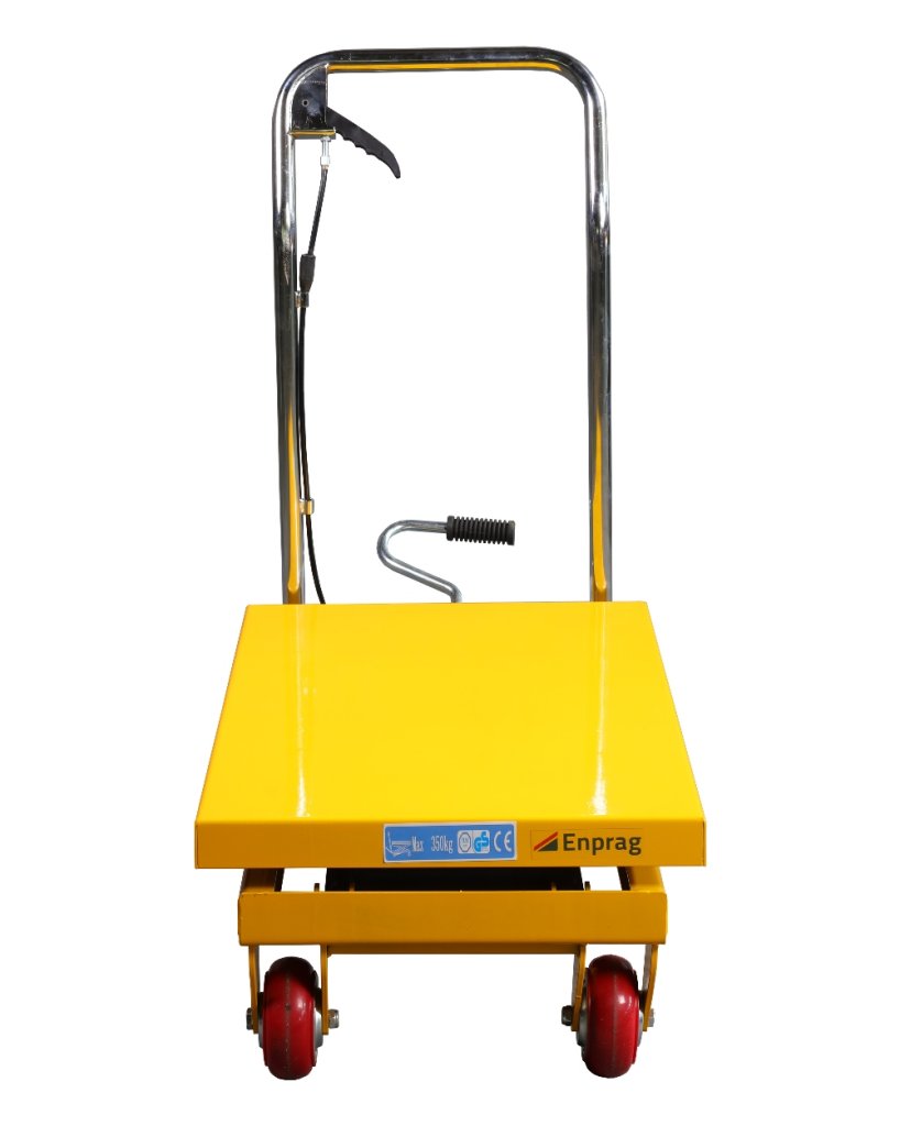 Scherenhebebühne ausgestattet mit Fußhydraulikpumpe mit einer Tragfähigkeit von 150 kg und maximaler Hubhöhe von 720 mm.