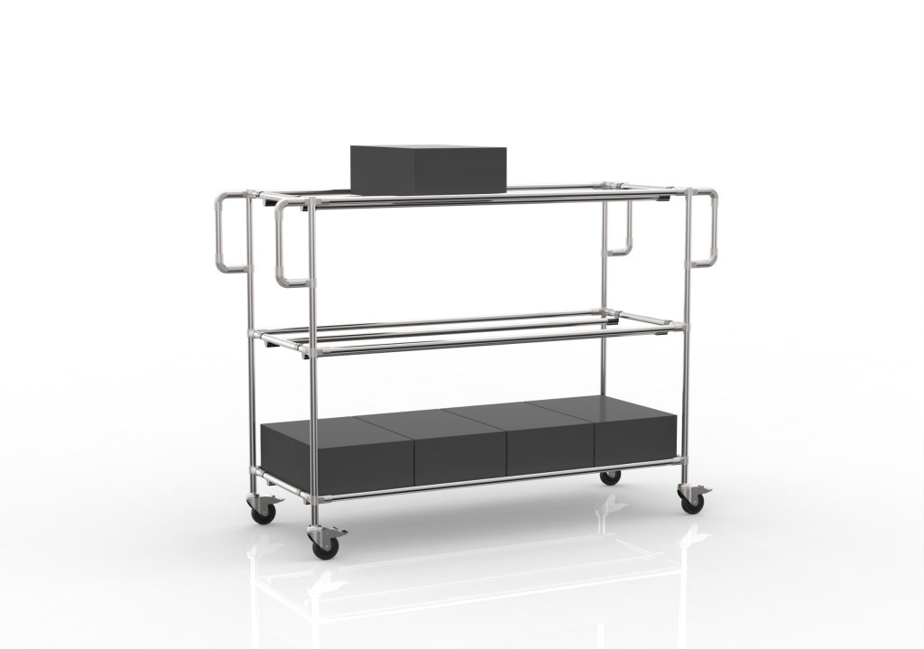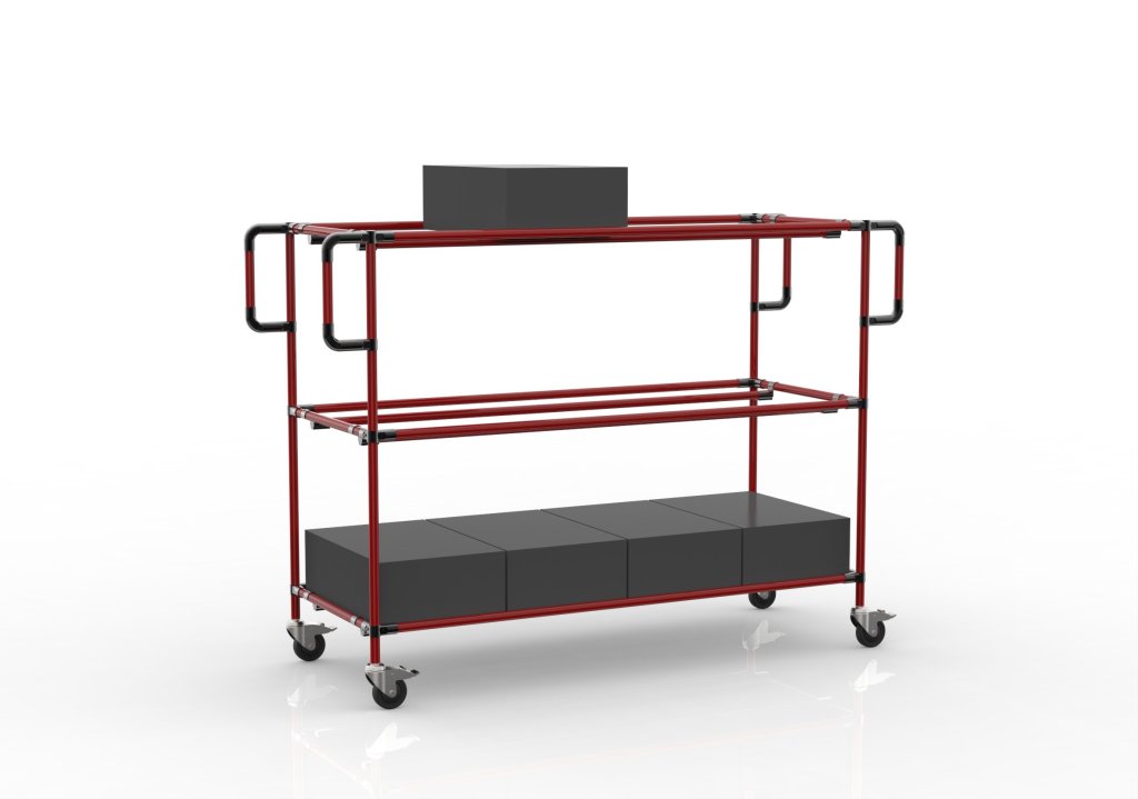 Hilfskommissionierwagen aus einem Rohrsystem. Dank des ergonomischen Designs mit Griffen lässt sich der Wagen leicht handhaben. vollständige Beschreibung und Parameter