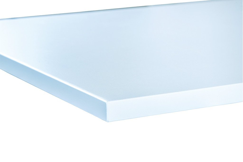 Arbeitsplatte, B x T x H 2000 x 750 x 25 mm. Laminierte LTD Spanplatte, die Platte bieten wirstandardmäßig in einer Dicke von 25 mm mit 2 mm ABS-Kante, im Farbton RAL 7035 an.