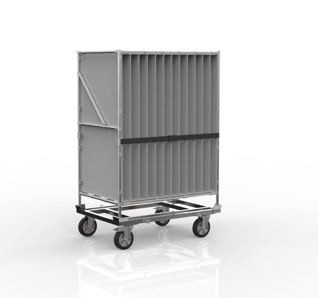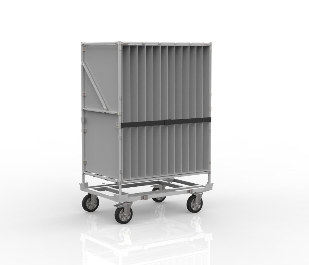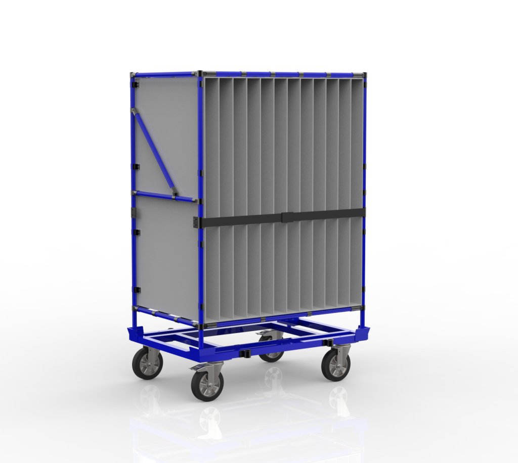 Geschweißter Wagen mit Aufbau aus Rohrsystem und zwei Regalböden. Die Basis des Wagens bildet ein geschweißter Stahlrahmen mit verzinkter Oberfläche, der Aufbau besteht aus einem Rohrbaukastensystem mit einer laminierten PP-Einlage mit herausnehmbarem Boden in jedem Fach. Zur Sicherung des gelagerten Materials dienen Spanngurte mit Schlaufen auf jeder Seite. Zudem sind zwei Lenkrollen mit Bremse und zwei Lenkrollen ohne Bremse mit einem Durchmesser von 200 mm enthalten. Die Tragfähigkeit des Wagens beträgt 240 kg. Die Tragfähigkeit der Regalböden beträgt 120 kg. Abmessungen: 1883 x 1203 x 803 mm.