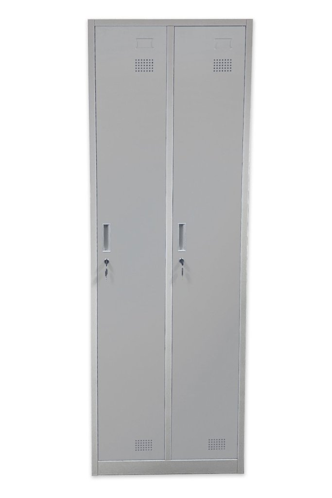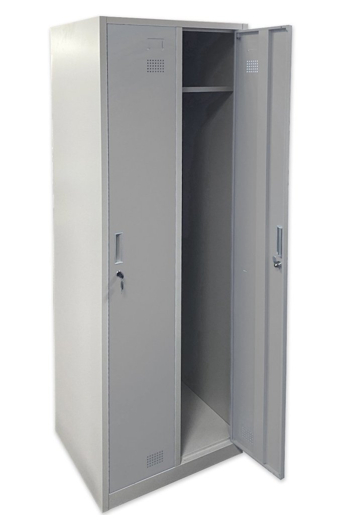 Garderobenschrank HDG-02, demontiert geliefert, H x B x T 1800 x 600 x 500 mm. Verschluss - Vorhängeschlossverschluss. Pulverbeschichtet, Korpus-/Türenfarbe RAL 7047 Telegrau.