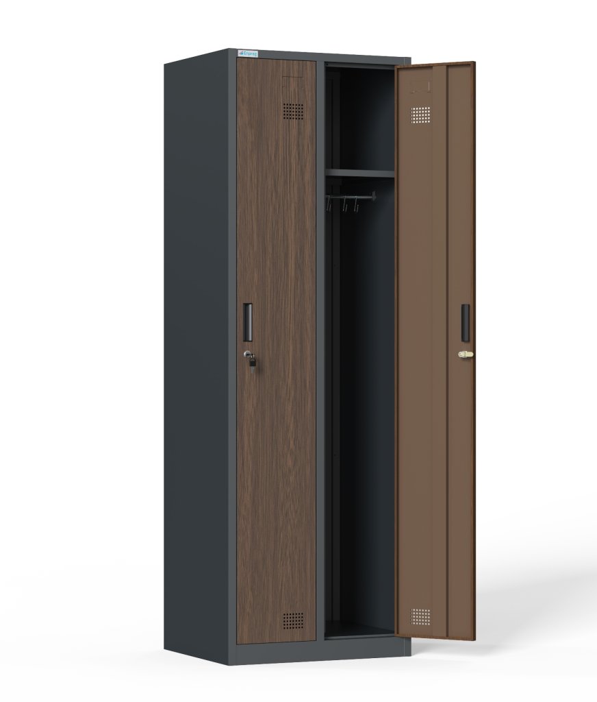 Garderobenschrank HDG-02, demontiert geliefert, H x B x T 1800 x 600 x 500 mm. Zylinderschloss, 2x Schlüssel. Pulverbeschichtet, Korpus-Türenfarbe anthrazit RAL 7016/dunkle Holznachbildung