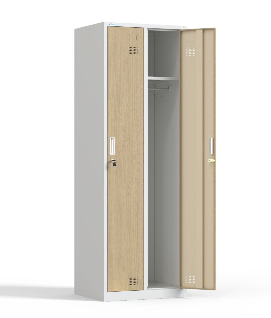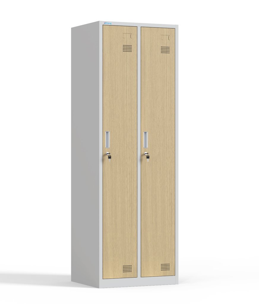 Garderobenschrank HDG-02, demontiert geliefert, H x B x T 1800 x 600 x 500 mm. Zylinderschloss, 2x Schlüssel. Pulverbeschichtet, Korpus-Türenfarbe RAL 7047 Telegrau/ Nachahmung helles Holz.
