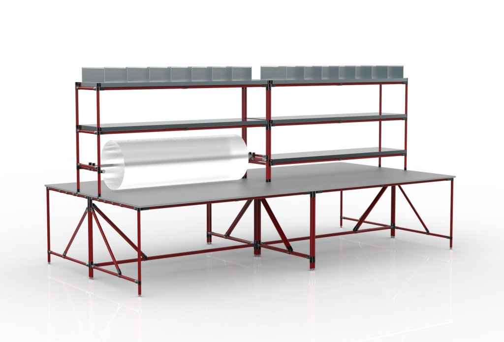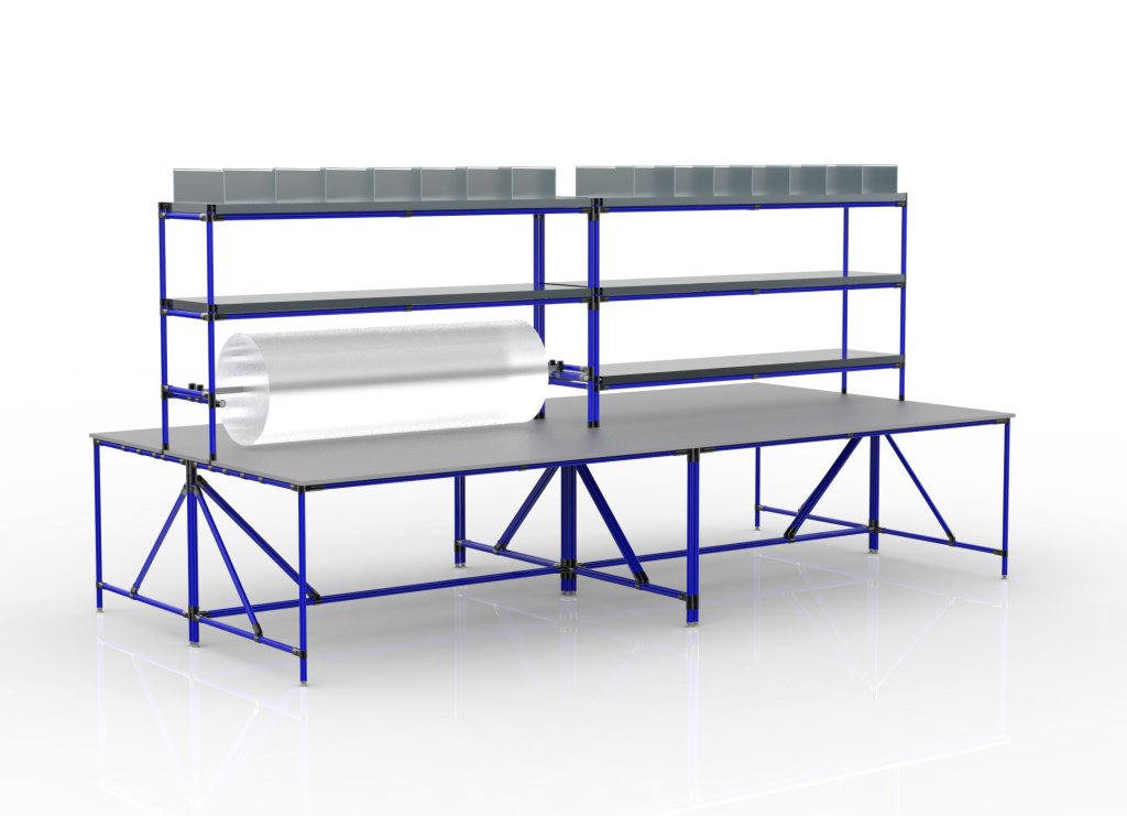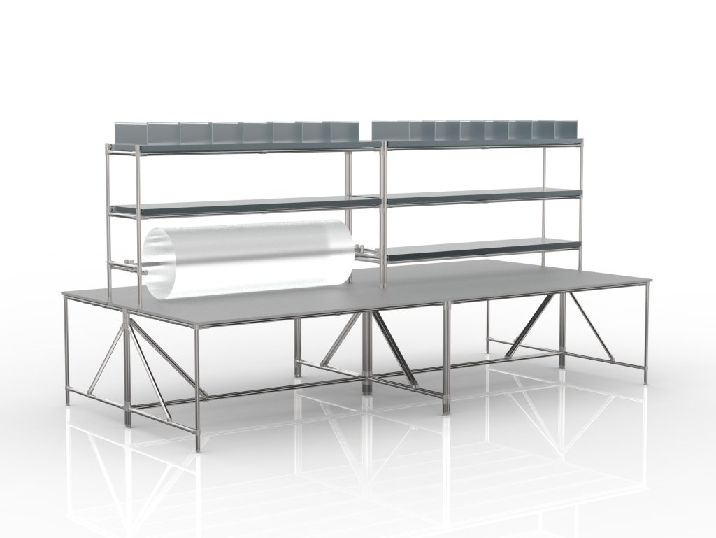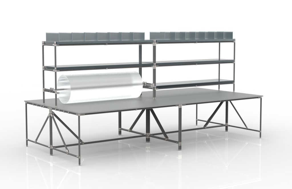 Montagearbeitsplatz aus einem Rohr-Baukastensystem. Die Konstruktion besteht aus vier separaten Tischen mit Aufsatz. Bestandteil der Konstruktion ist eine Arbeitsplatte aus Laminat mit einer Stärke von 18 mm, verzinkte Regale und Regale mit Trennwand, sowie eine Stange zur Befestigung von Folie. Nach dem Abbau des oberen Aufsatzes können die Tische beliebig getrennt werden. Gesamte Tragfähigkeit 550 kg, Tragfähigkeit der Arbeitsplatte 75 kg, Tragfähigkeit der Regale 50 kg. Abmessungen 2100 x 4140 x 2000 mm.