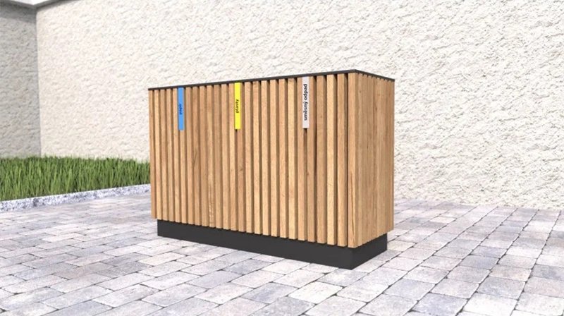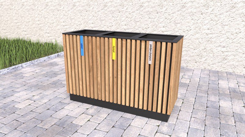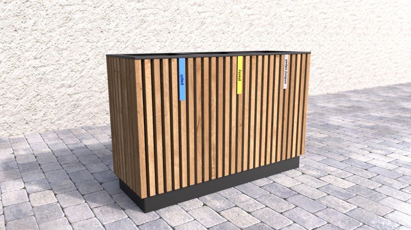 Mülleimer 3-fach, Lamela, mit Holzbelattung, Holzlatten 3-fach lasiert, pulverbeschichtet oder feuerverzinkt. vollständige Beschreibung und Parameter