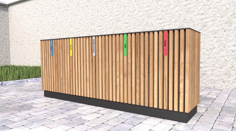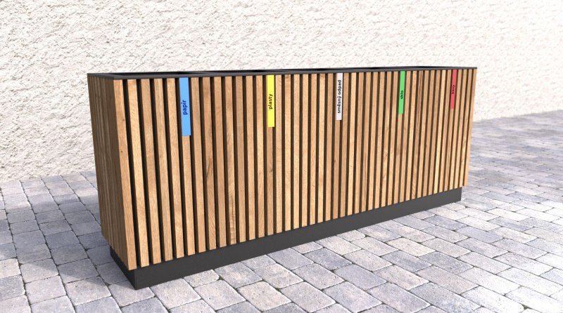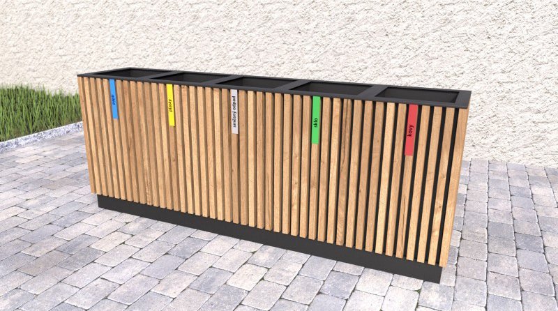 Mülleimer 5-fach, Lamela, mit Holzbelattung, Holzlatten 3-fach lasiert, pulverbeschichtet oder feuerverzinkt. vollständige Beschreibung und Parameter