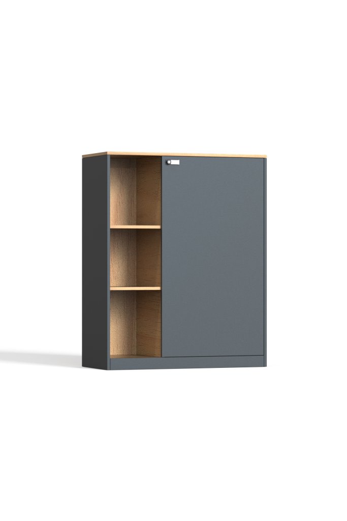 Schrank mit Flügel- und Schiebetüren aus 0,6 mm starkem Stahlblech. Höhe 1800 x Breite 900 x Tiefe 390 mm, 2x Fachböden, 1x Nische, 1x Zylinderschloss mit zwei Schlüsseln und 1x Codeschloss. Oberflächenbehandlung mit dunkelgrauer Pulverfarbe in heller Holzimitation.