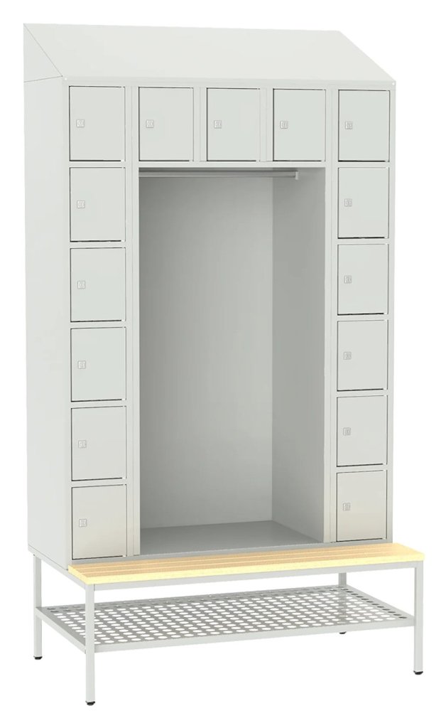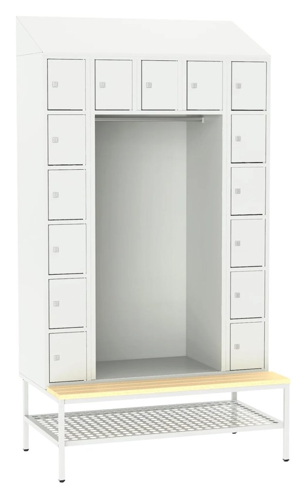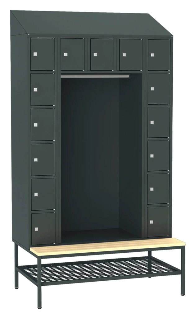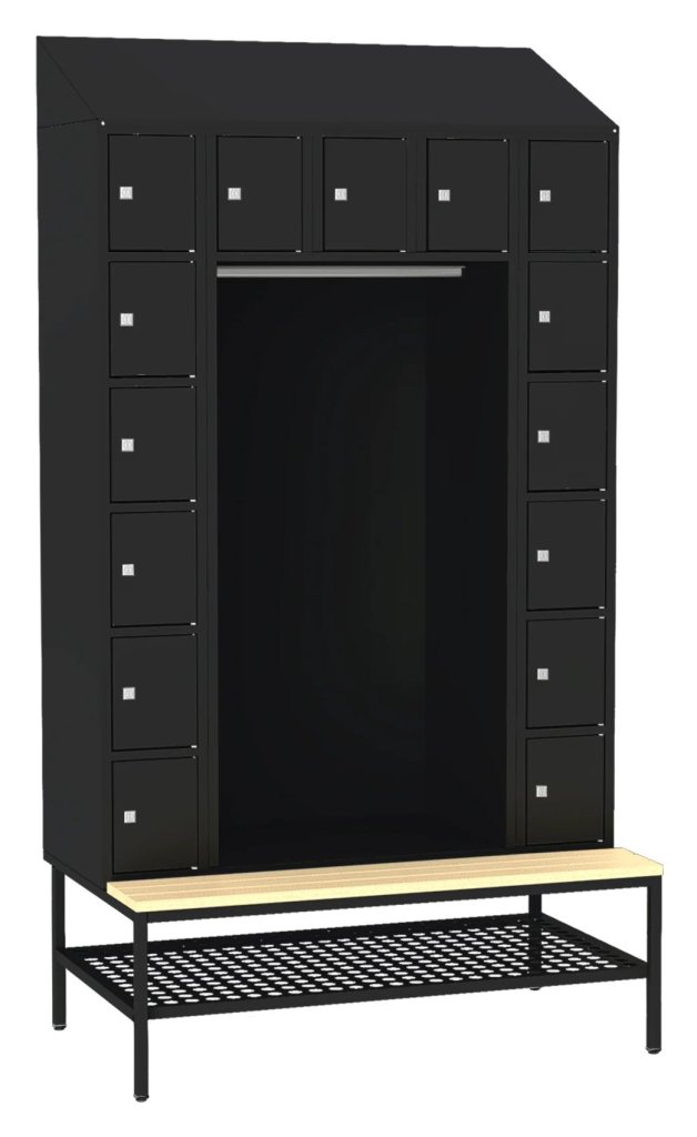 Offene Garderobe mit Schließfächern SZOG 0101040201, 15x Schließfach, Kleiderstange, Sitzbank mit Holzauflage, Schuhrost perforiert, 16 Farben zur Auswahl ohne Aufpreis.