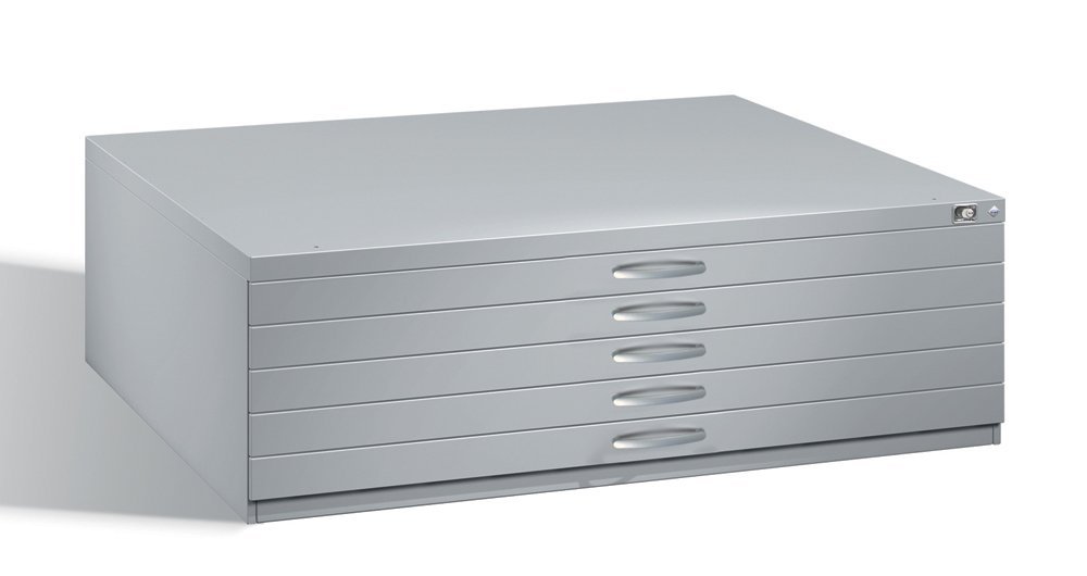 Zeichnungsschrank, B x H x T 1336 x 435 x 1006 mm. Korpusfarben RAL 7035 Lichtgrau.
