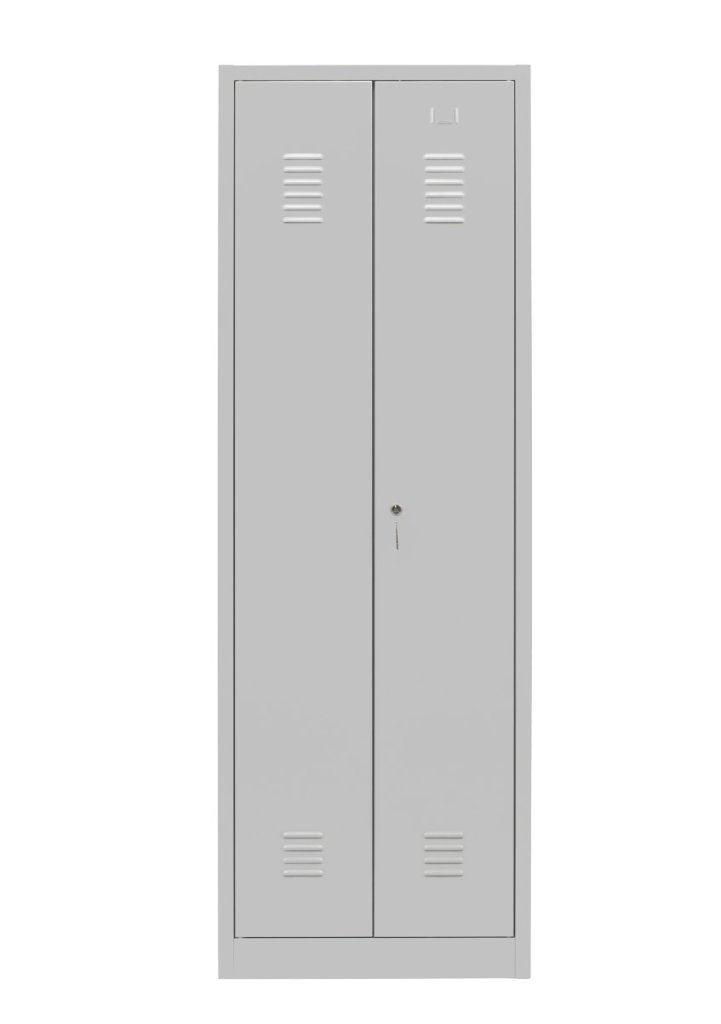 Raumpflegeschrank CLC/FD.1860.G, verschweißte Konstruktion, Lüftungsschlitze. H x B x T 1800 x 600 x 500 mm. 4 Fachböden links, Kleiderstange mit Schiebehaken und 1x Fachboden rechts. Korpus-/Türenfarbe RAL 7035 Lichtgrau.
