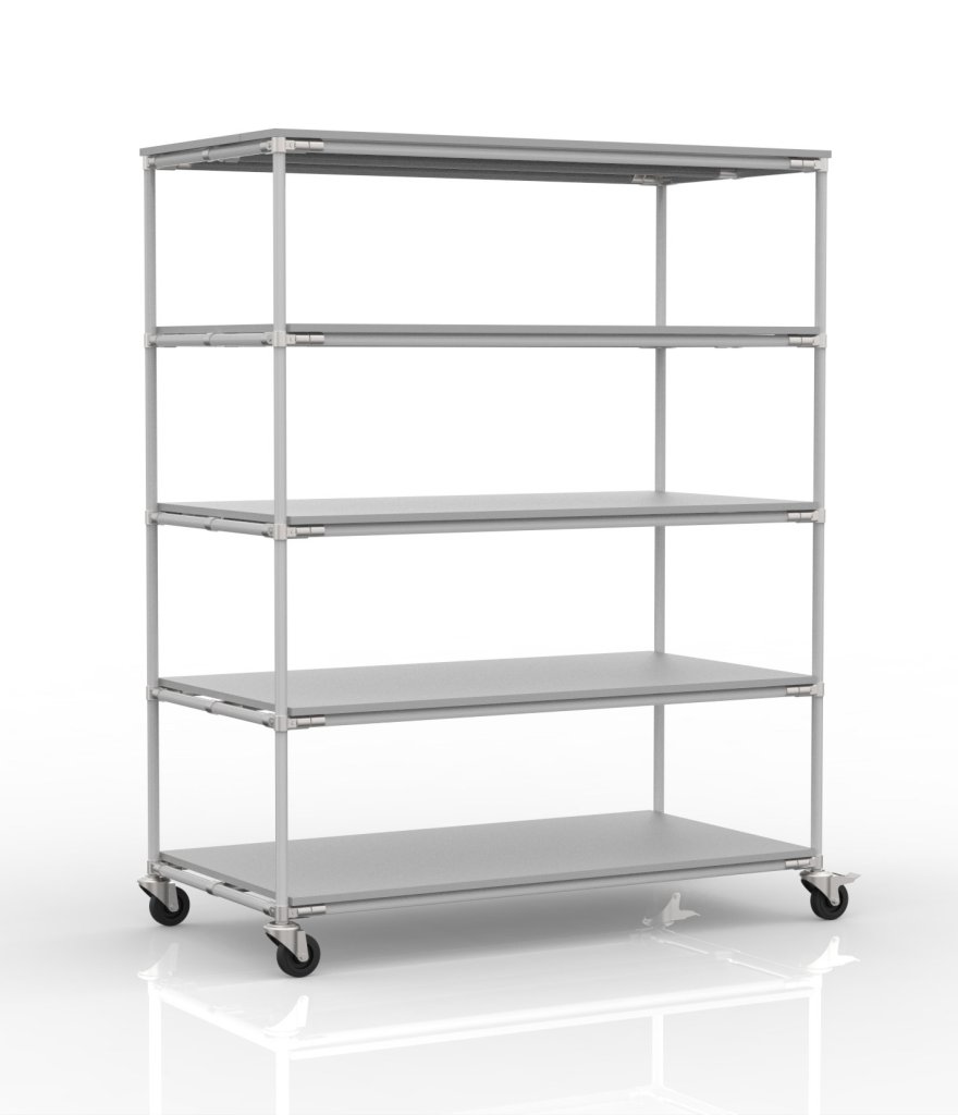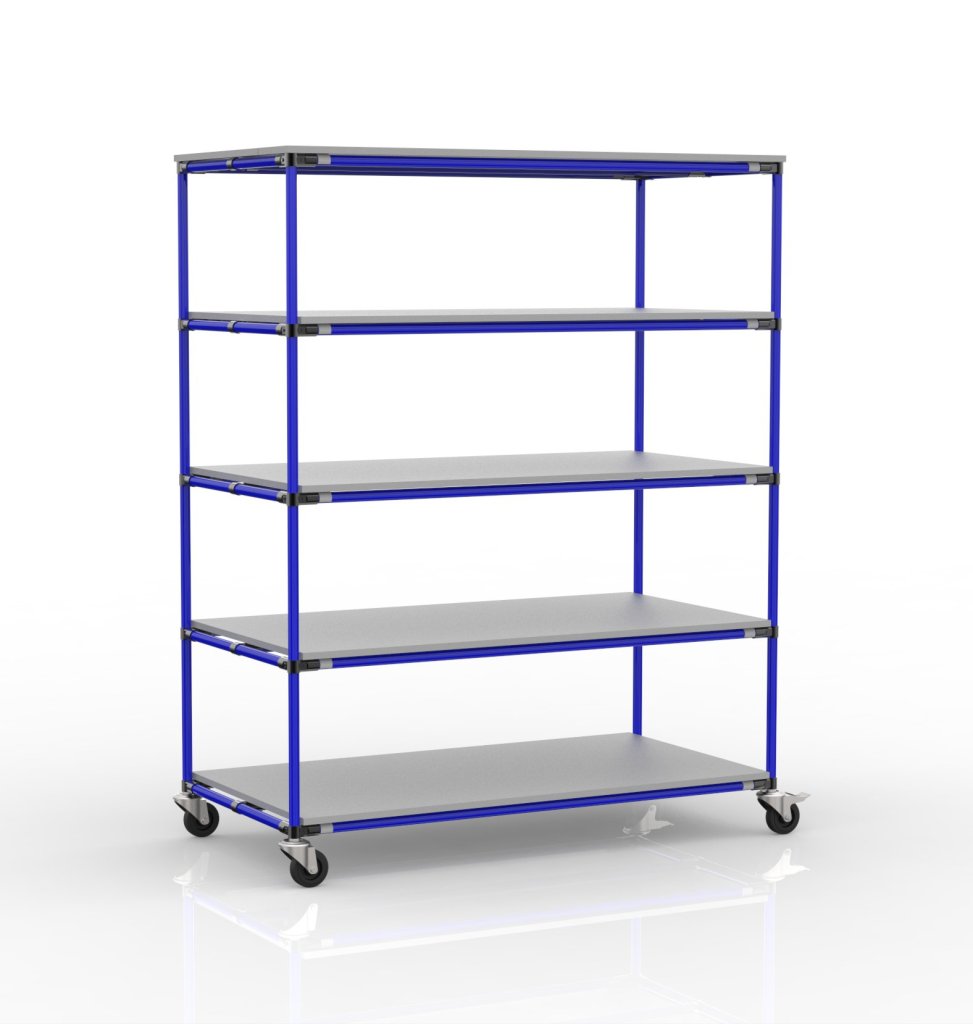 Das Regal mit fünf geraden Böden ist ein praktischer Helfer für den Einsatz in Produktionsunternehmen und Logistikzentren, insbesondere im Bereich E-Commerce. Der Wagen ist mit vier schwenkbaren Rollen mit einem Durchmesser von 100 mm ausgestattet. Der Vorteil dieser Rollen ist der geringe Rollwiderstand, der eine komfortable Handhabung ermöglicht. Die Konfiguration der Rollen kann je nach Kundenwunsch geändert werden. Die Gesamttragfähigkeit beträgt 300 kg, die Tragfähigkeit pro Regalboden 75 kg. Abmessungen: 1900 x 1505 x 755 mm.