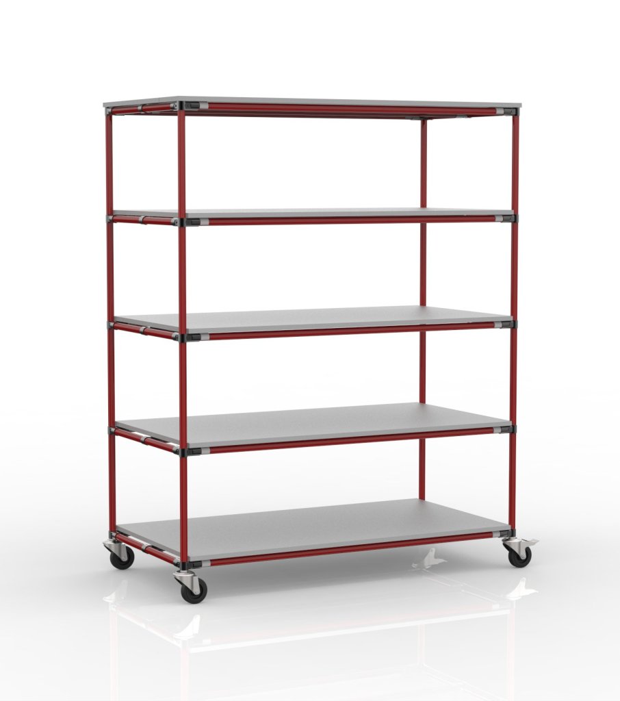 Das Regal mit fünf geraden Böden ist ein praktischer Helfer für den Einsatz in Produktionsunternehmen und Logistikzentren, insbesondere im Bereich E-Commerce. Der Wagen ist mit vier schwenkbaren Rollen mit einem Durchmesser von 100 mm ausgestattet. Der Vorteil dieser Rollen ist der geringe Rollwiderstand, der eine komfortable Handhabung ermöglicht. Die Konfiguration der Rollen kann je nach Kundenwunsch geändert werden. Die Gesamttragfähigkeit beträgt 300 kg, die Tragfähigkeit pro Regalboden 75 kg. Abmessungen: 1900 x 1505 x 755 mm.