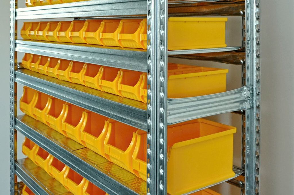 Regal mit Sichtlagerkästen 877851009_VAR_3, Steckregal, 12x Fachboden, Tragkraft 125 kg, Gesamttragkraft 1100 kg, H x B x T 1972 x 1124 x 330 mm, 60x Sichtlagerkasten 456232, 35x Sichtlagerkasten 456209, 2 Jahre Garantie