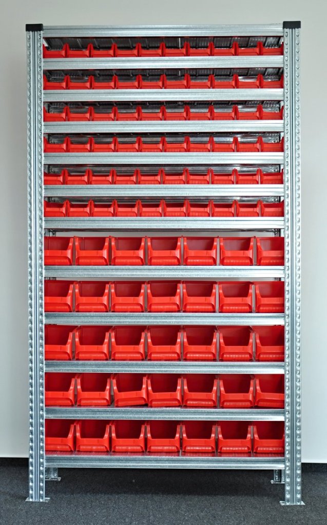 Regal mit Sichtlagerkästen 877851009_VAR_1, Steckregal, 12x Fachboden, Tragkraft 125 kg, Gesamttragkraft 1100 kg, H x B x T 1972 x 1124 x 330 mm, 60x Sichtlagerkasten 456232, 35x Sichtlagerkasten 456210, 2 Jahre Garantie