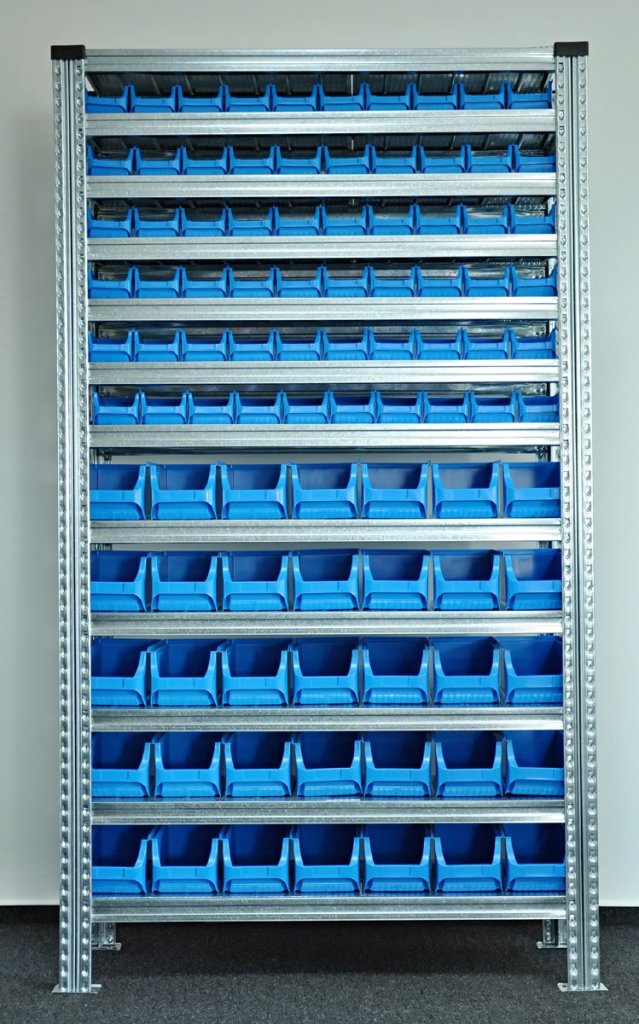 Regal mit Sichtlagerkästen 877851009_VAR_1, Steckregal, 12x Fachboden, Tragkraft 125 kg, Gesamttragkraft 1100 kg, H x B x T 1972 x 1124 x 330 mm, 60x Sichtlagerkasten 456232, 35x Sichtlagerkasten 456210, 2 Jahre Garantie