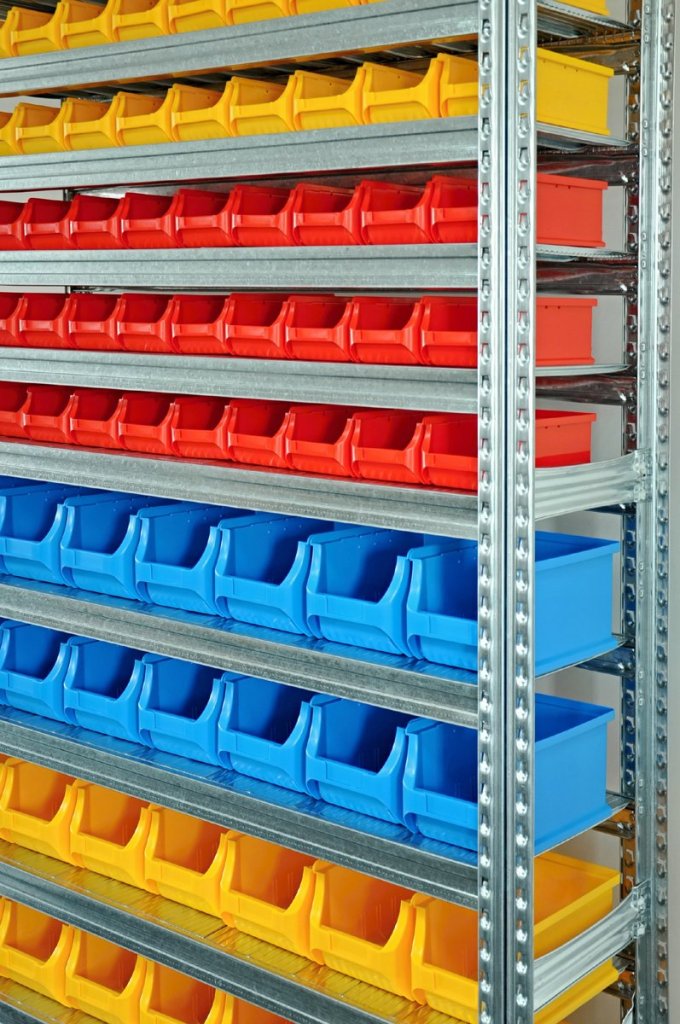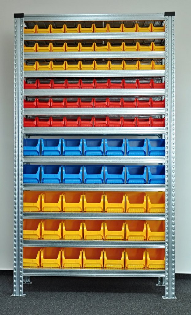 Regal mit Sichtlagerkästen 877851009_VAR_1, Steckregal, 12x Fachboden, Tragkraft 125 kg, Gesamttragkraft 1100 kg, H x B x T 1972 x 1124 x 330 mm, 60x Sichtlagerkasten 456232, 35x Sichtlagerkasten 456210, 2 Jahre Garantie