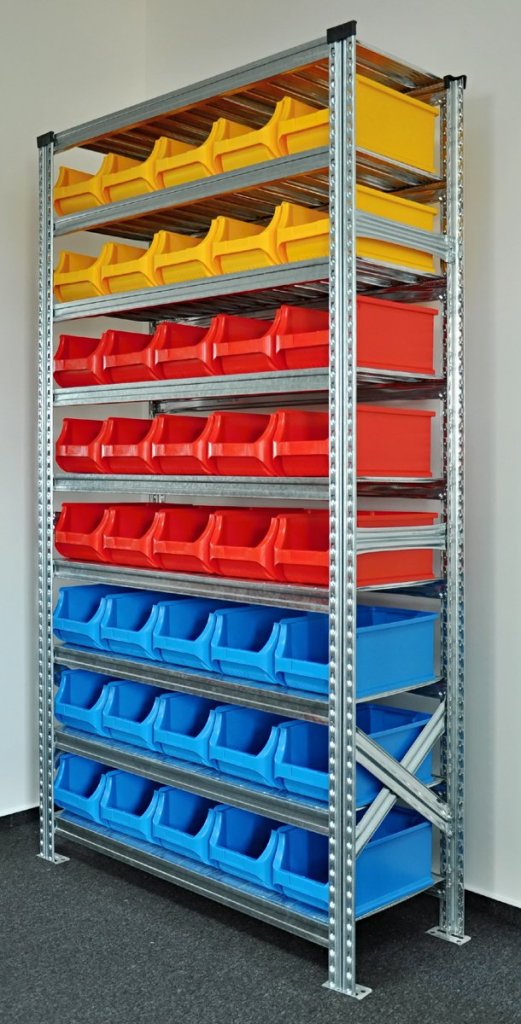 Regal mit Sichtlagerkästen 877851017_VAR_6, Steckregal, 9x Fachboden, Tragkraft 125 kg, Gesamttragkraft 1100 kg, H x B x T 1972 x 1124 x 410 mm, 20x Sichtlagerkasten 456213, 20x Sichtlagerkasten 456212, 2 Jahre Garantie
