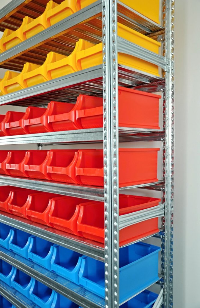 Regal mit Sichtlagerkästen 877851017_VAR_1, Steckregal, 9x Fachboden, Tragkraft 125 kg, Gesamttragkraft 1100 kg, H x B x T 1972 x 1124 x 410 mm, 40x Sichtlagerkasten 456214, 2 Jahre Garantie