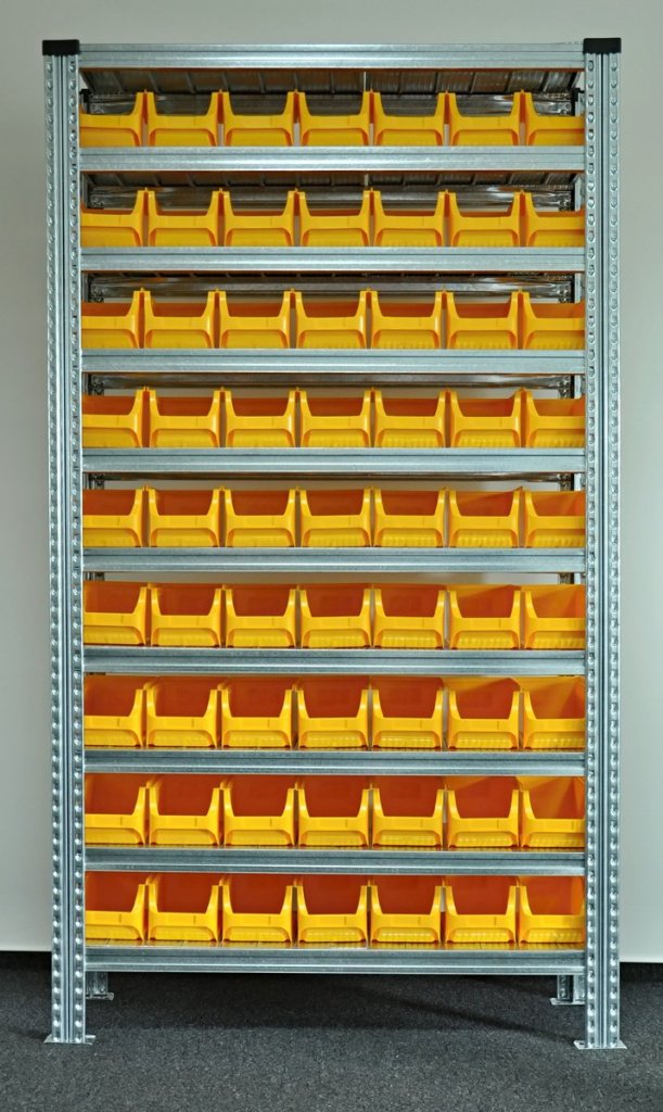 Regal mit Sichtlagerkästen 877851018_VAR_3, Steckregal, 10x Fachboden, Tragkraft 125 kg, Gesamttragkraft 1100 kg, H x B x T 1972 x 1124 x 330 mm, 63x Sichtlagerkasten 456208, 2 Jahre Garantie